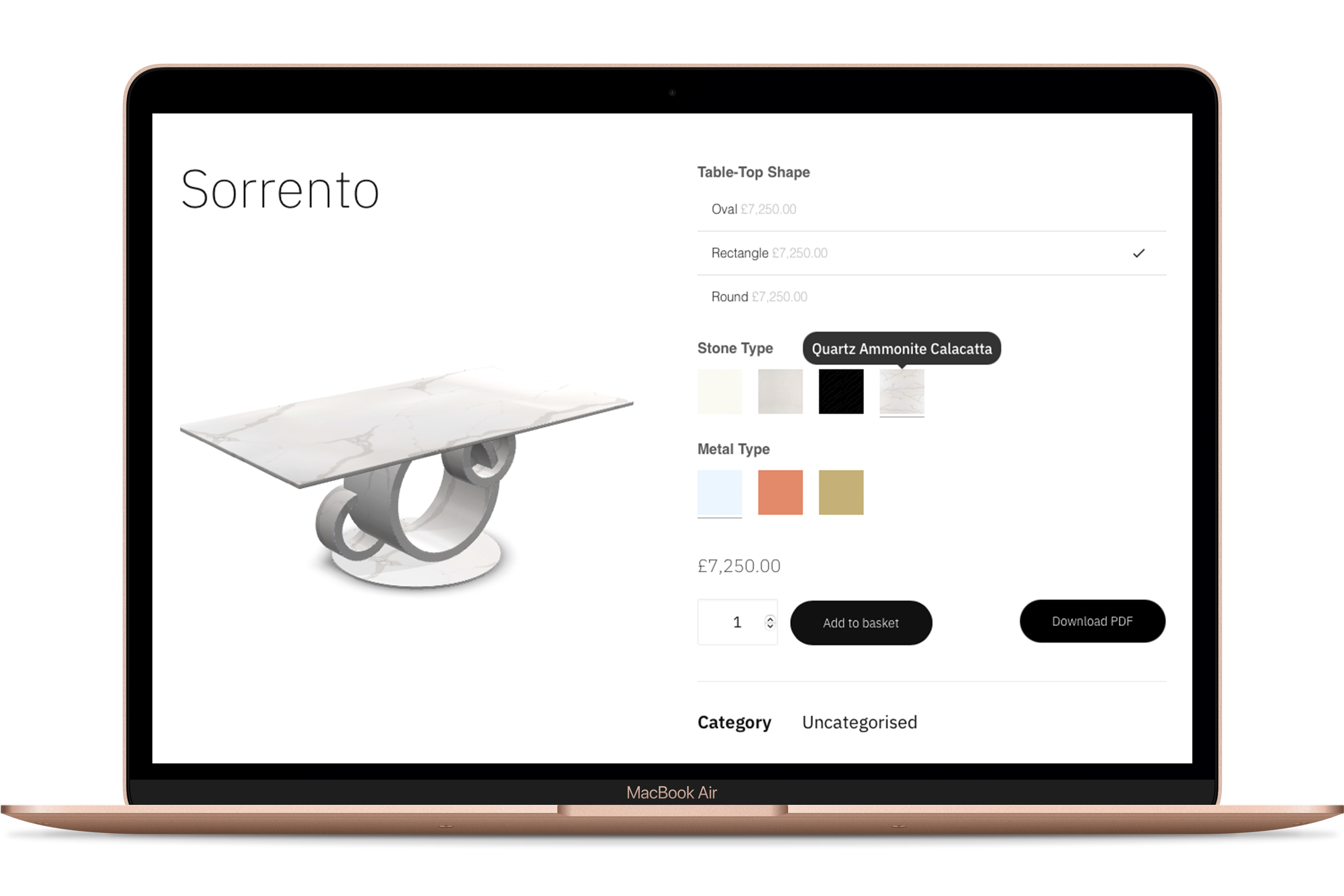 A 3D model is loaded into the browser using a JavaScript platform (Three.js) and is placed into a simulate environment. Lighting and materials are applied live, allowing the user to customise and rotate the product on the fly.